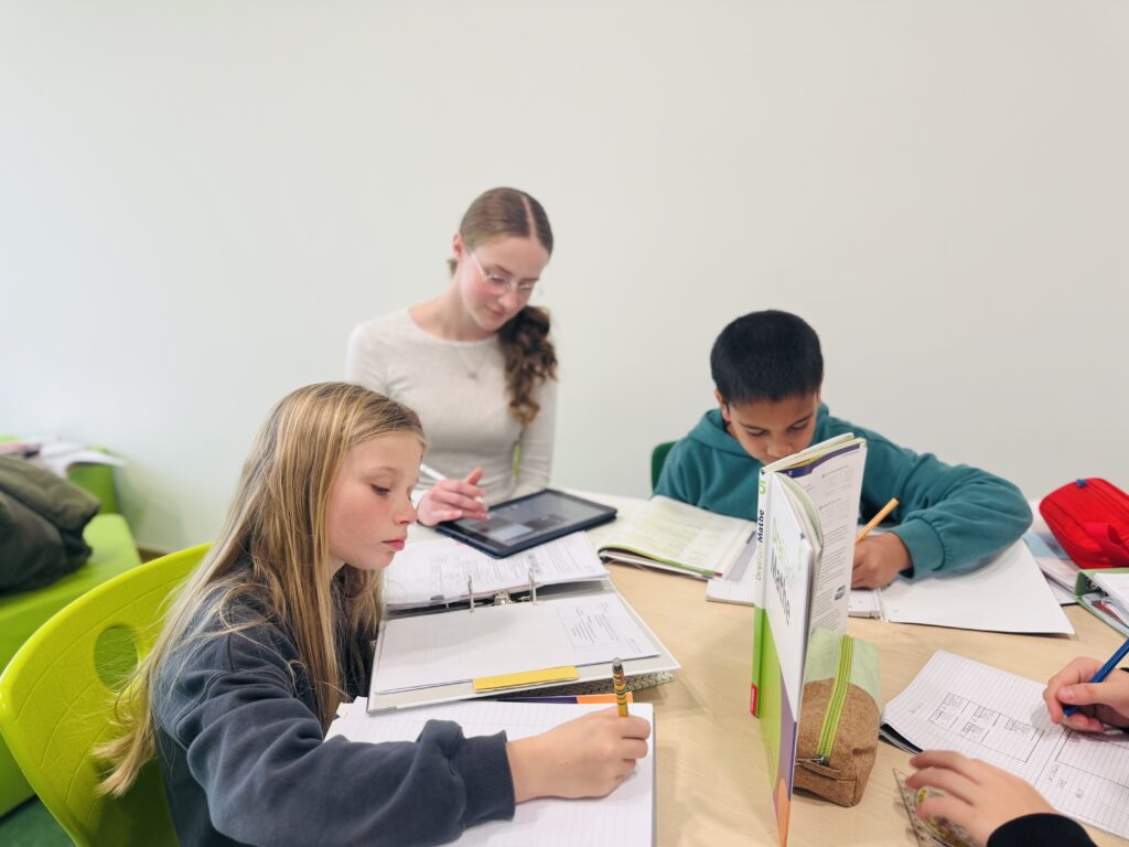 Zur Unterstützung stehen verschiedene Hilfsmittel bereit: etwa Sicht- oder Hörschutz sowie digitale Medien wie iPads für Recherchen, Hörtexte, Lernvideos oder eigene Produktionen. Das „stille Lernbüro“ bietet sich für konzentriertes Arbeiten in Ruhe an. Wer im Team arbeiten möchte, kann einen Platz im Gruppenarbeitsraum reservieren. Hier wird das Motto lebendig: Kinder lernen voneinander, indem sie Ideen austauschen und Lösungen gemeinsam entwickeln.
