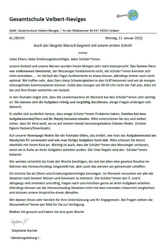 Homeschooling und die Probleme – System IServ war vollkommen überlastet – lesen sie hier weiter Elternbrief